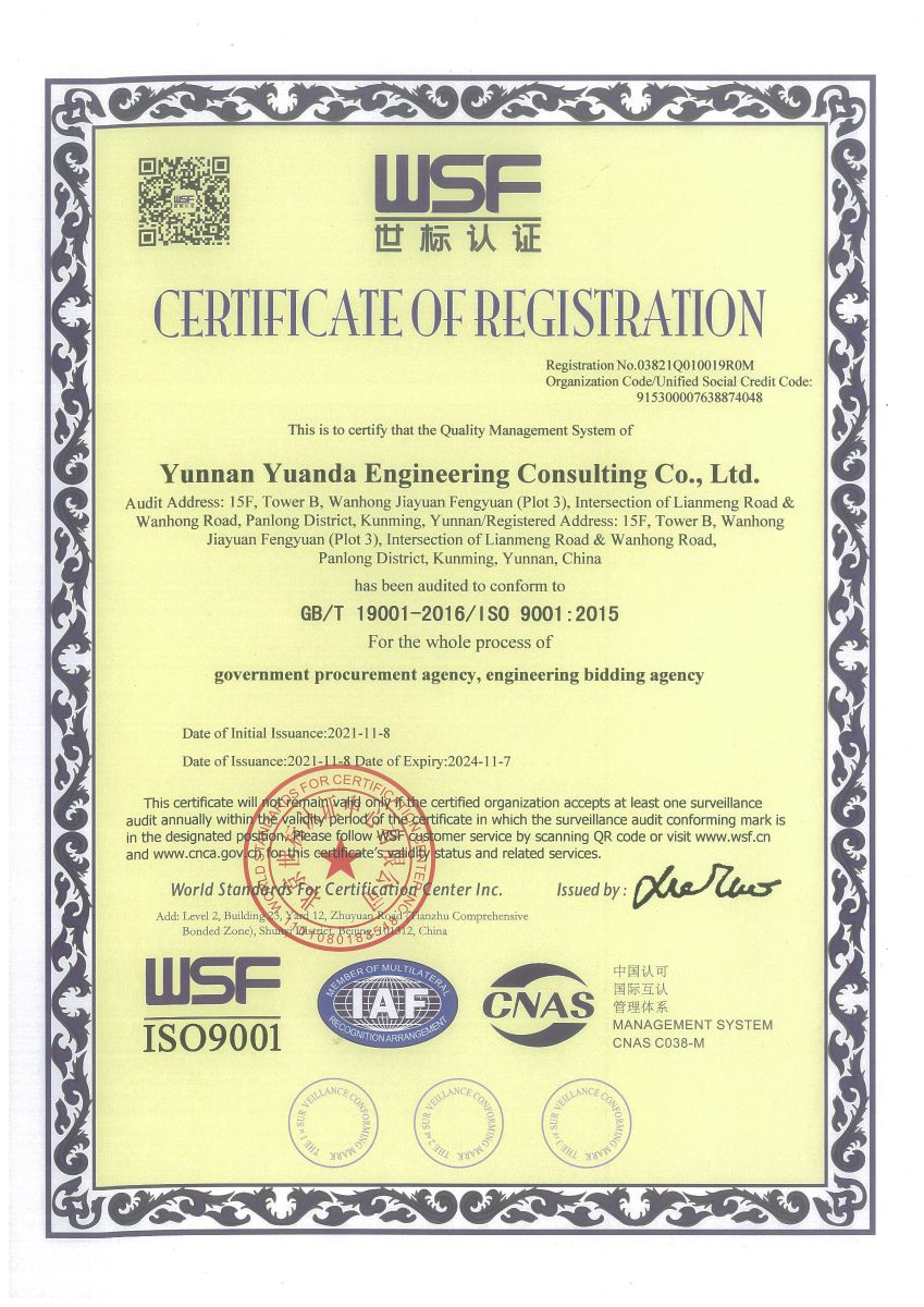 公司是云南省招標投標行業協會會長單位,現為云南省住建廳信用評級招標代理機構AAA級單位。公司先后榮獲住建部頒發的“工程招標代理機構甲級資質證書”、財政部頒發的“政府采購代理機構甲級資格證書”,并在財政部及中國政府采購網“政府采購代理機構名單”登記備案、獲得國家發展改革委頒發的“中央投資項目招標代理機構甲級資格證書”、商務部頒發的“國際招標機構預乙級資格證書”、機電產品國際招標電子交易平臺頒發的“機電產品國際招標電子交易證書”、國家國防科技工業局頒發的“軍工涉密業務咨詢服務安全保密條件備案證書”。公司已通過ISO9001:2015質量管理體系認證、ISO14001:2015環境管理體系認證、ISO45001:2018職業健康安全管理體系認證。納稅信用評價已連續三年被評為A級......